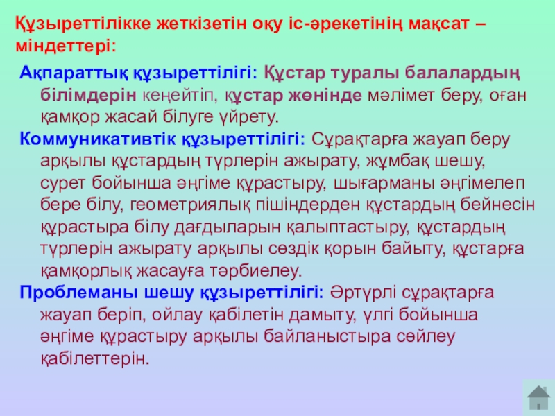Құзыреттілікке жеткізетін оқу іс-әрекетінің мақсат –міндеттері: