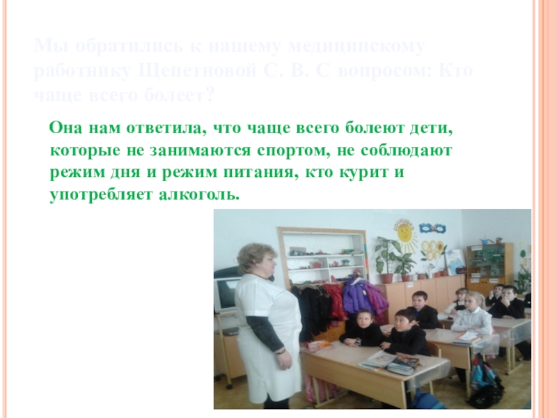 Она нам ответила, что чаще всего болеют дети, которые не занимаются спортом, не соблюдают режим дня и режим питания, кто курит и употребляет алкоголь.