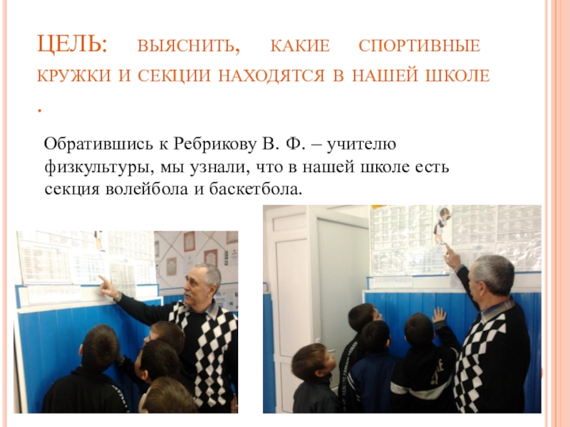 Обратившись к Ребрикову В. Ф. – учителю физкультуры, мы узнали, что в нашей школе есть секция волейбола и баскетбола.