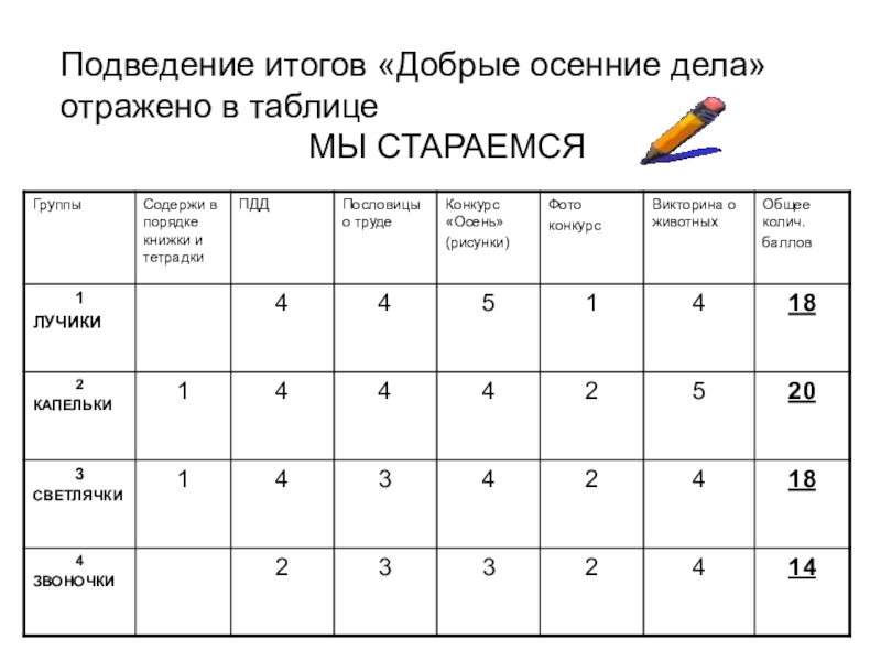 Слайд 9Подведение итогов «Добрые осенние дела» отражено в таблице