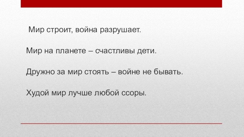 Мир строит, война разрушает.  Мир на планете – счастливы дети.  Дружно за мир стоять