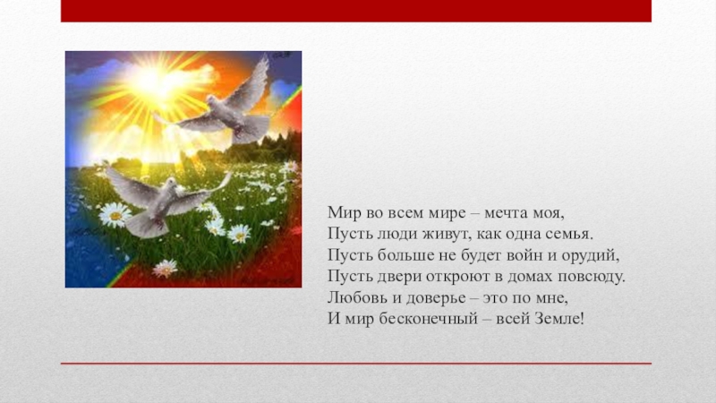 Слайд 9Мир во всем мире – мечта моя, Пусть люди живут, как