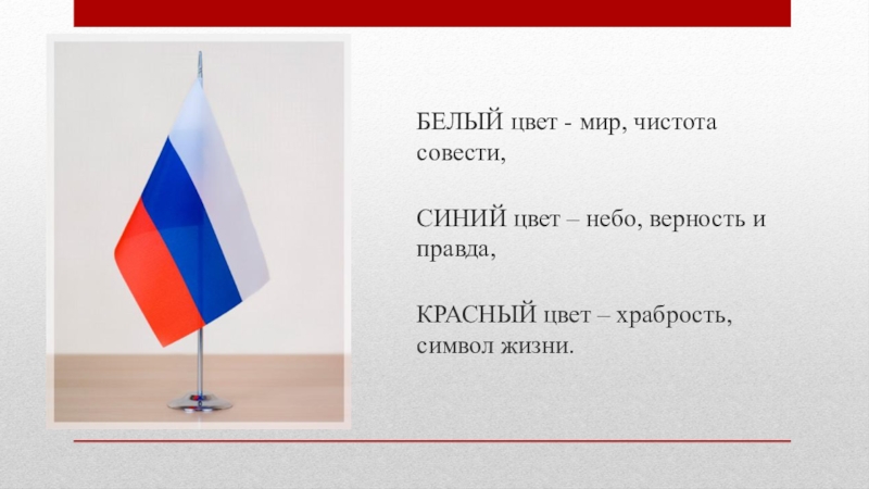 БЕЛЫЙ цвет - мир, чистота совести,  СИНИЙ цвет – небо, верность и правда,  КРАСНЫЙ цвет