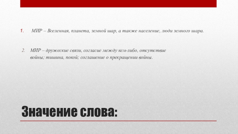 Значение слова:МИР – Вселенная, планета, земной шар, а также население, люди земного шара. 2. МИР – дружеские связи, согласие между кем-либо, отсутствие войны; тишина, покой; соглашение о прекращении войны.