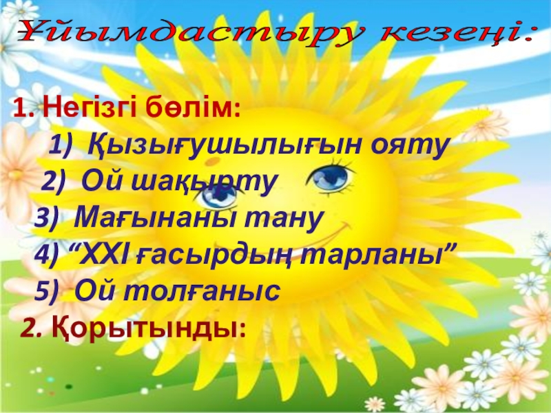 Ұйымдастыру кезеңі: Негізгі бөлім:  1) Қызығушылығын ояту  2) Ой шақырту 3) Мағынаны тану 4)