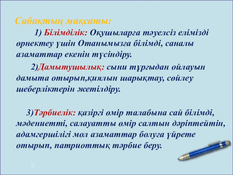 Сабақтың мақсаты:     1) Білімділік: Оқушыларға тәуелсіз елімізді өрнектеу үшін Отанымызға білімді,