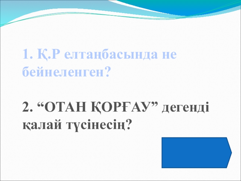 Слайд 41. Қ.Р елтаңбасында не бейнеленген? 2. “ОТАН ҚОРҒАУ” дегенді қалай түсінесің?