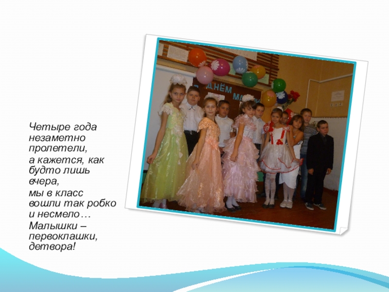 Четыре года незаметно пролетели,а кажется, как будто лишь вчера,мы в класс вошли так робко и несмело…Малышки –