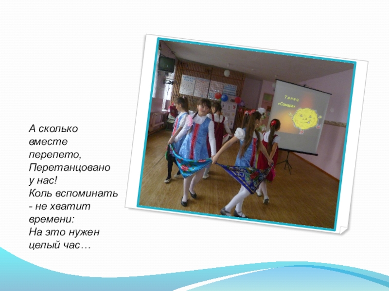 Слайд 9А сколько вместе перепето, Перетанцовано у нас! Коль вспоминать - не хватит времени: На