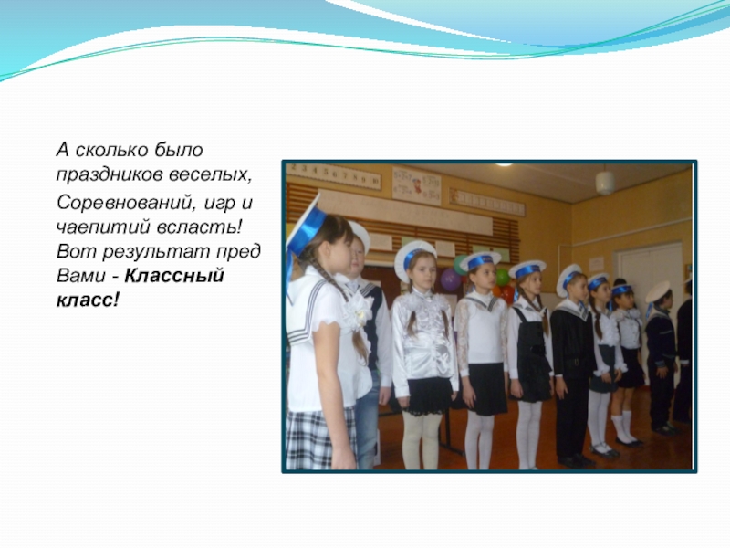 А сколько было праздников веселых,Соревнований, игр и чаепитий всласть! Вот результат пред Вами - Классный класс!