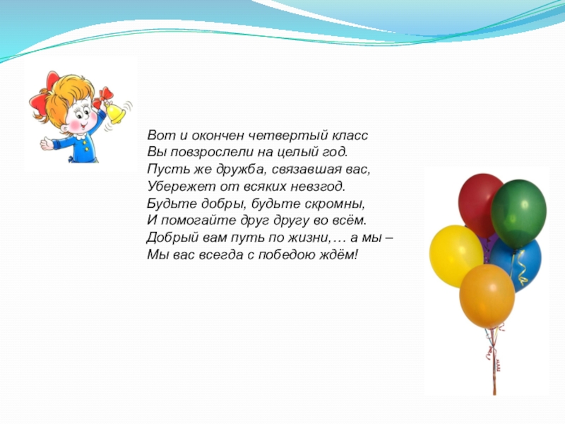 Вот и окончен четвертый класс Вы повзрослели на целый год. Пусть же дружба, связавшая вас, Убережет от