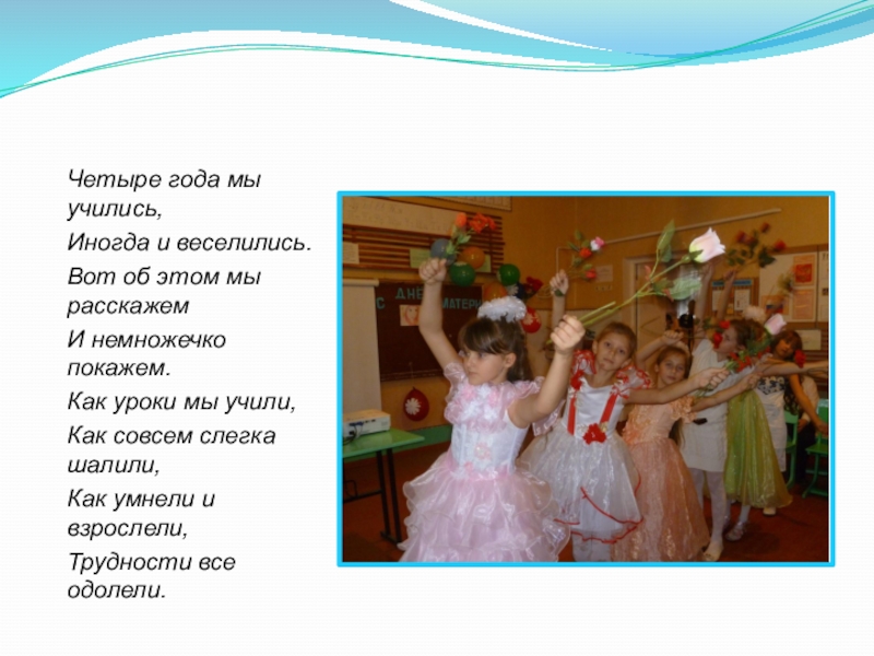 Четыре года мы учились,Иногда и веселились.Вот об этом мы расскажемИ немножечко покажем.Как уроки мы учили,Как совсем слегка