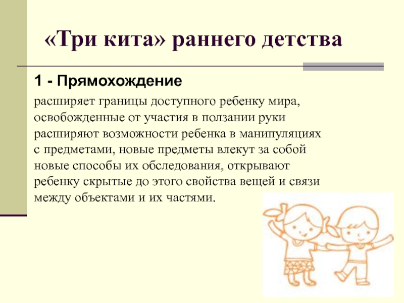 освобожденные от участия в ползании руки расширяют возможности ребенка в манипуляциях с предметами, новые предметы влекут за собой новые способы их обследования, открывают ребенку скрытые до этого свойства вещей и связи между объектами и их частями.