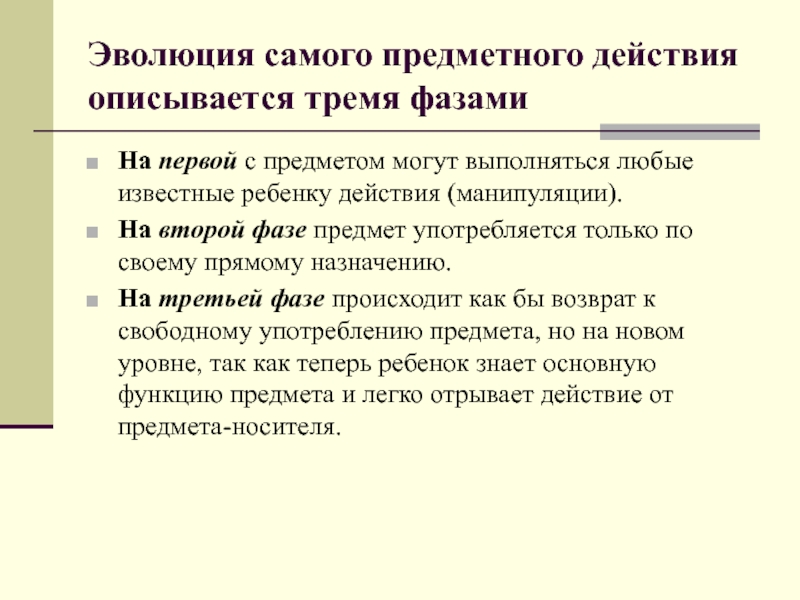 Слайд 8Эволюция самого предметного действия описывается тремя фазами
