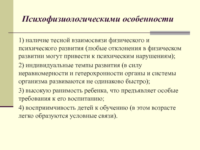 1) наличие тесной взаимосвязи физического и психического развития (любые