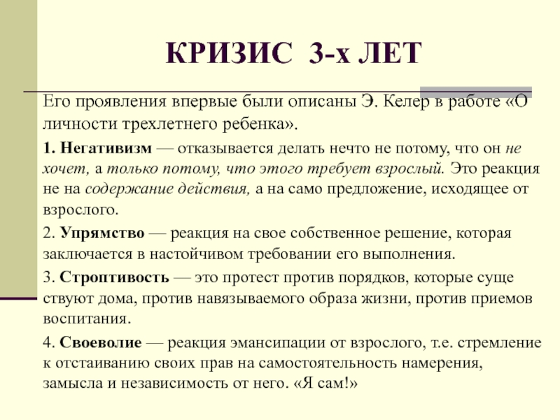 1. Негативизм — отказывается делать нечто не потому, что он не хочет, а только потому, что этого требует взрослый. Это реакция не на содержание действия, а на само предложение, исходящее от взрослого.