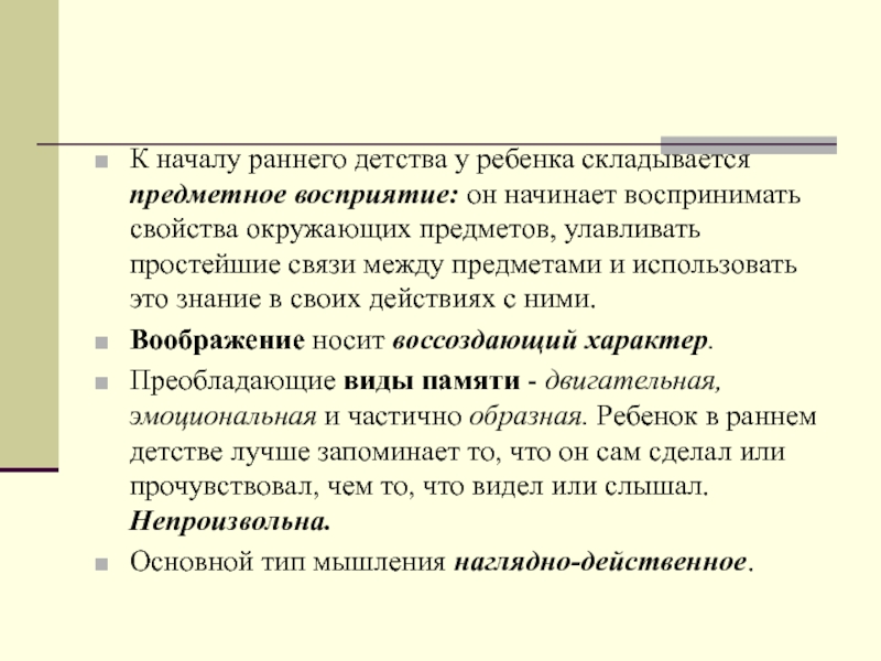 К началу раннего детства у ребенка складывается предметное восприятие: он начинает