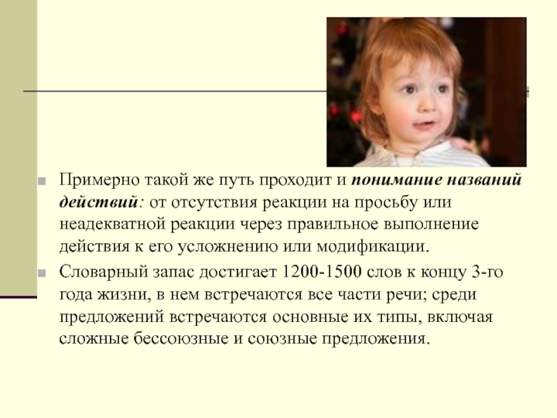Словарный запас достигает 1200-1500 слов к концу 3-го года жизни, в нем встречаются все части речи; среди предложений встречаются основные их типы, включая сложные бессоюзные и союзные предложения.