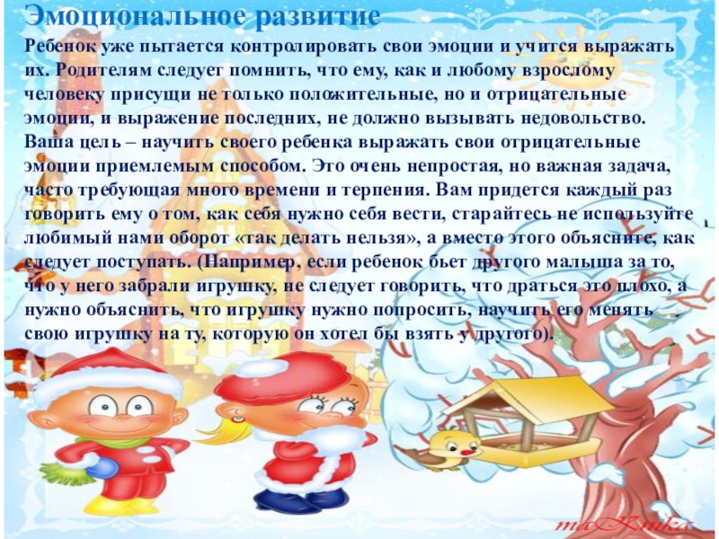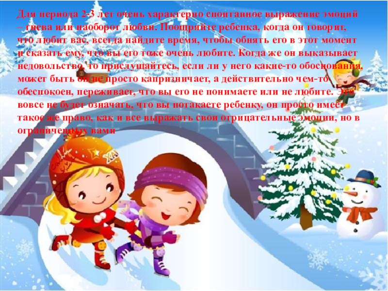 Слайд 6Для периода 2-3 лет очень характерно спонтанное выражение эмоций – гнева