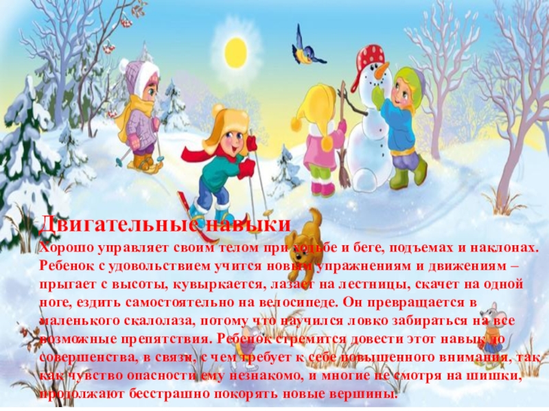 наклонах. Ребенок с удовольствием учится новым упражнениям и движениям – прыгает с высоты, кувыркается, лазает на лестницы, скачет на одной ноге, ездить самостоятельно на велосипеде. Он превращается в маленького скалолаза, потому что научился ловко забираться на все возможные препятствия. Ребенок стремится довести этот навык до совершенства, в связи, с чем требует к себе повышенного внимания, так как чувство опасности ему незнакомо, и многие не смотря на шишки, продолжают бесстрашно покорять новые вершины.