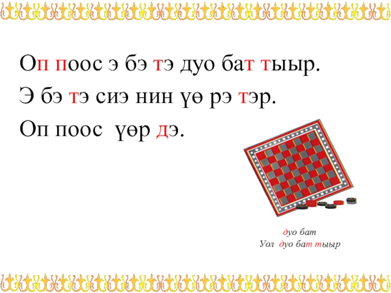 Слайд 6Оп поос э бэ тэ дуо бат тыыр.