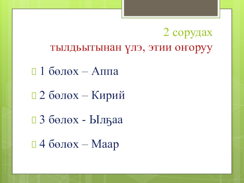 2 сорудах тылдьытынан үлэ, этии оҥоруу1 бөлөх – Аппа2 бөлөх – Кирий3 бөлөх - Ылҕаа4 бөлөх –