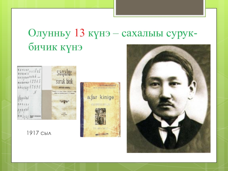 Слайд 3Олунньу 13 күнэ – сахалыы сурук-бичик күнэ