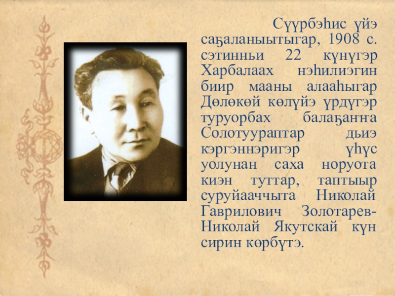 сэтинньи 22 күнүгэр Харбалаах нэһилиэгин биир мааны алааһыгар Дөлөкөй көлүйэ үрдүгэр туруорбах балаҕаҥҥа Солотуураптар дьиэ кэргэннэригэр үһүс уолунан саха норуота киэн туттар, таптыыр суруйааччыта Николай Гаврилович Золотарев-Николай Якутскай күн сирин көрбүтэ.