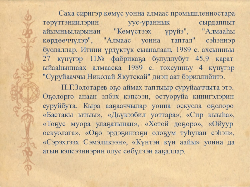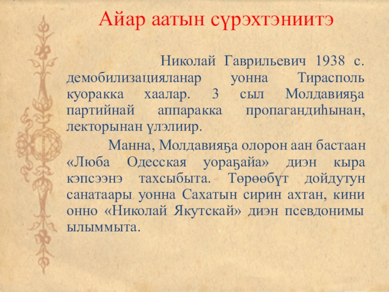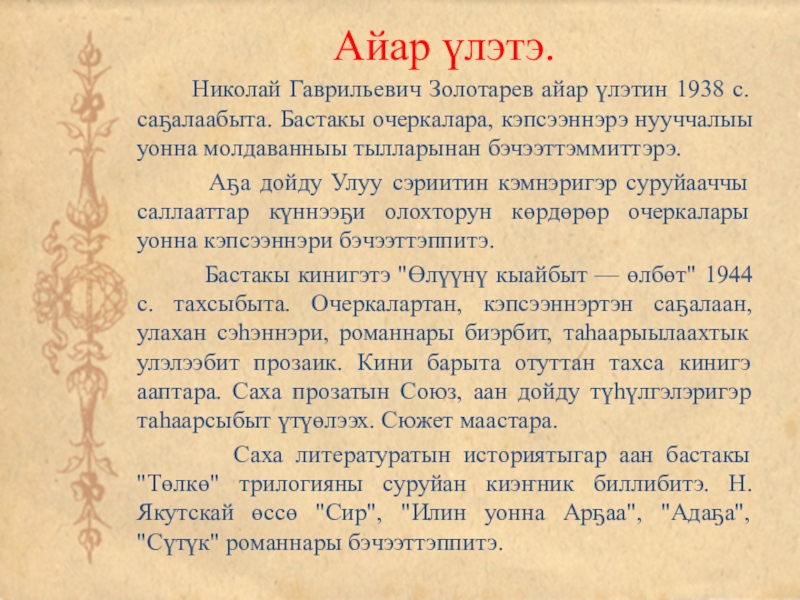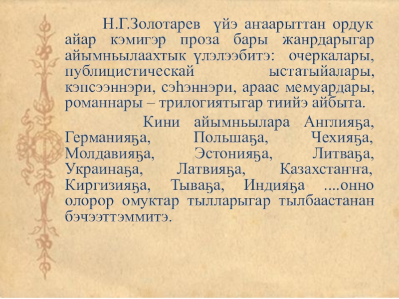 Слайд 9 Н.Г.Золотарев үйэ аҥаарыттан ордук айар кэмигэр проза бары