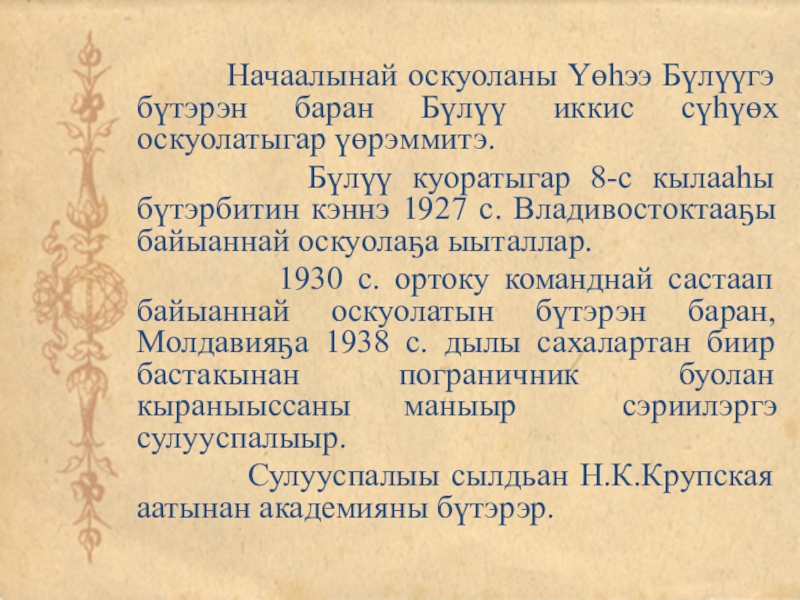 Слайд 4 Начаалынай оскуоланы Үөһээ Бүлүүгэ бүтэрэн баран