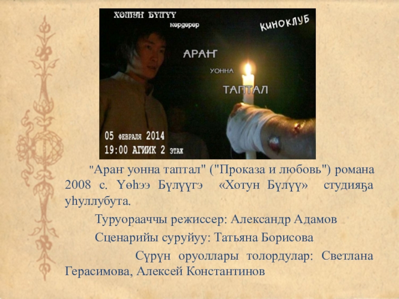 Слайд 12 "Араҥ уонна таптал" ("Проказа и любовь") романа