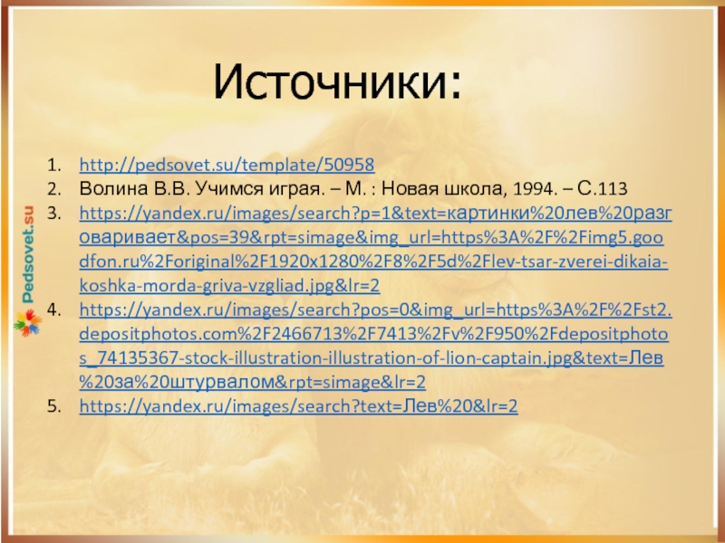 Источники:http://pedsovet.su/template/50958Волина В.В. Учимся играя. – М. : Новая школа, 1994. – С.113https://yandex.ru/images/search?p=1&text=картинки%20лев%20разговаривает&pos=39&rpt=simage&img_url=https%3A%2F%2Fimg5.goodfon.ru%2Foriginal%2F1920x1280%2F8%2F5d%2Flev-tsar-zverei-dikaia-koshka-morda-griva-vzgliad.jpg&lr=2 https://yandex.ru/images/search?pos=0&img_url=https%3A%2F%2Fst2.depositphotos.com%2F2466713%2F7413%2Fv%2F950%2Fdepositphotos_74135367-stock-illustration-illustration-of-lion-captain.jpg&text=Лев%20за%20штурвалом&rpt=simage&lr=2https://yandex.ru/images/search?text=Лев%20&lr=2