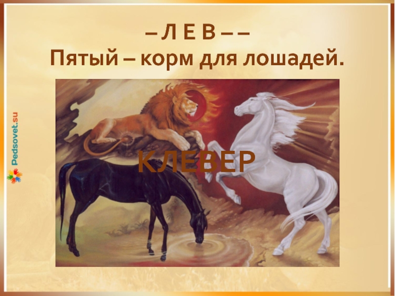 Слайд 6– Л Е В – – Пятый – корм для лошадей.