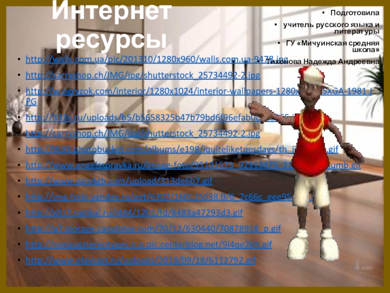 Интернет ресурсыhttp://walls.com.ua/pic/201310/1280x960/walls.com.ua-9478.jpghttp://carryshop.ch/IMG/jpg/shutterstock_25734492-2.jpghttp://w.ogryzok.com/interior/1280x1024/interior-wallpapers-1280x1024-SXGA-1981.JPGhttp://333v.ru/uploads/b5/b5658325b47b79bd6f96efab0c786965.jpghttp://carryshop.ch/IMG/jpg/shutterstock_25734492-2.jpghttp://th39.photobucket.com/albums/e198/iquiteliketuesdays/th_jitterbug.gifhttp://www.engelsspravka.ru/image-foto/95101573_92913475_2130658_thumb.gifhttp://www.pics4gb.com/upload/313de6b7.gifhttp://img-fotki.yandex.ru/get/6307/160125038.0/0_7c66c_eee95dc5_XLhttp://s017.radikal.ru/i444/1201/fd/8483a47293d3.gifhttp://p7.storage.canalblog.com/70/12/630440/70878918_p.gifhttp://nonauxstereotypes.n.o.pic.centerblog.net/9i4qe2dh.gifhttp://www.playcast.ru/uploads/2013/09/18/6112792.gifПодготовила учитель русского языка и литературыГУ «Мичуинская средняя школа»Тихонова Надежда Андреевна