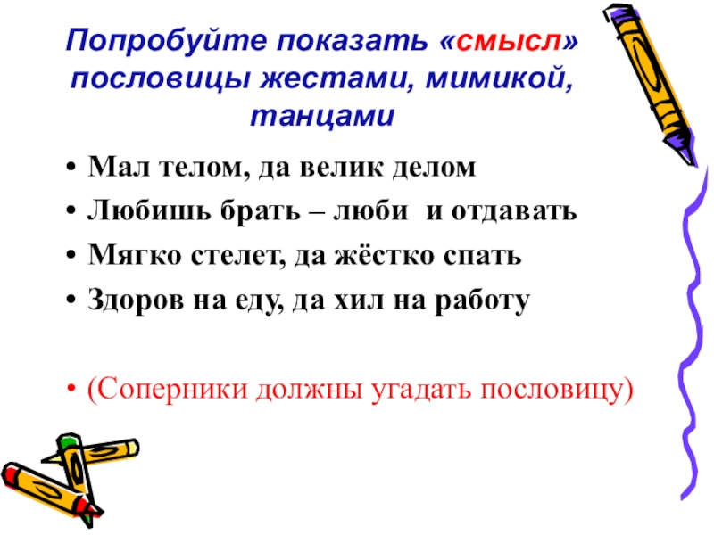 Слайд 45Попробуйте показать «смысл» пословицы жестами, мимикой, танцами