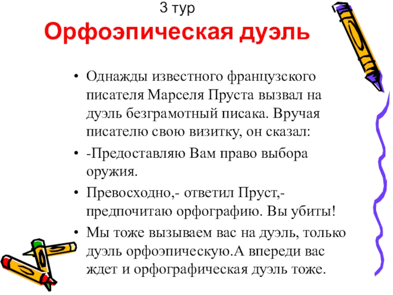 Мы тоже вызываем вас на дуэль, только дуэль орфоэпическую.А впереди вас ждет и орфографическая дуэль тоже.