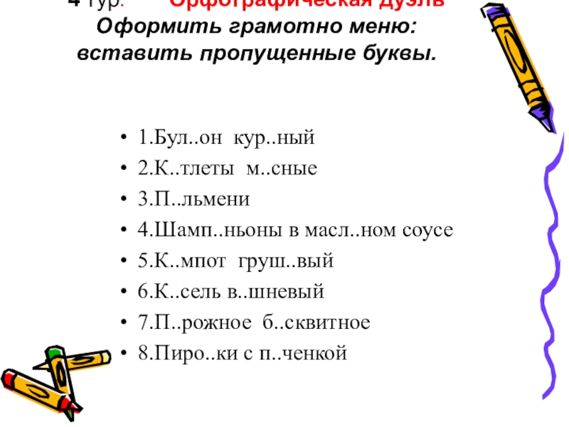 Слайд 224 тур. Орфографическая дуэль