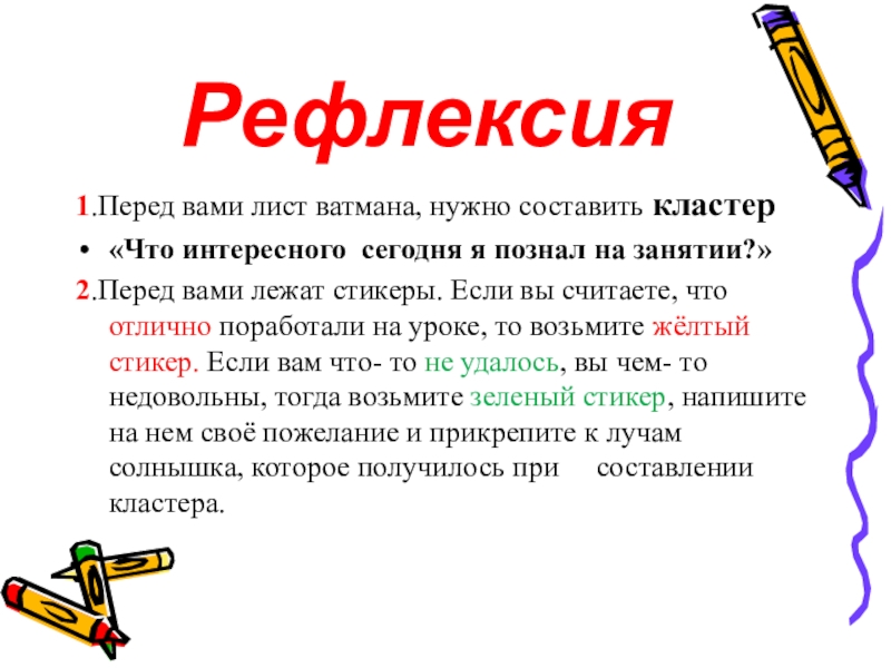 2.Перед вами лежат стикеры. Если вы считаете, что отлично поработали на уроке, то возьмите жёлтый стикер. Если вам что- то не удалось, вы чем- то недовольны, тогда возьмите зеленый стикер, напишите на нем своё пожелание и прикрепите к лучам солнышка, которое получилось при составлении кластера.