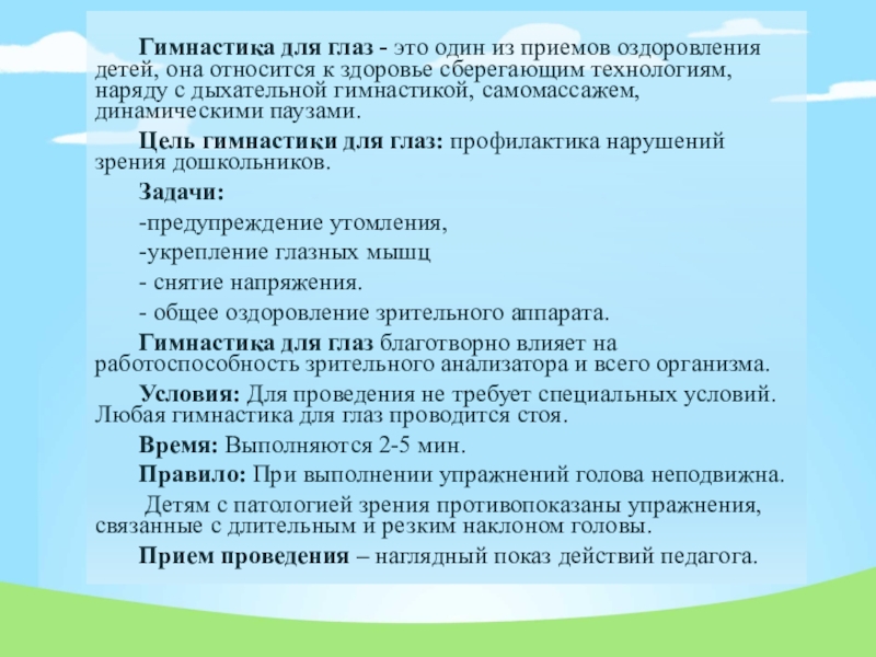 Гимнастика для глаз - это один из приемов оздоровления детей, она относится к здоровье сберегающим технологиям, наряду