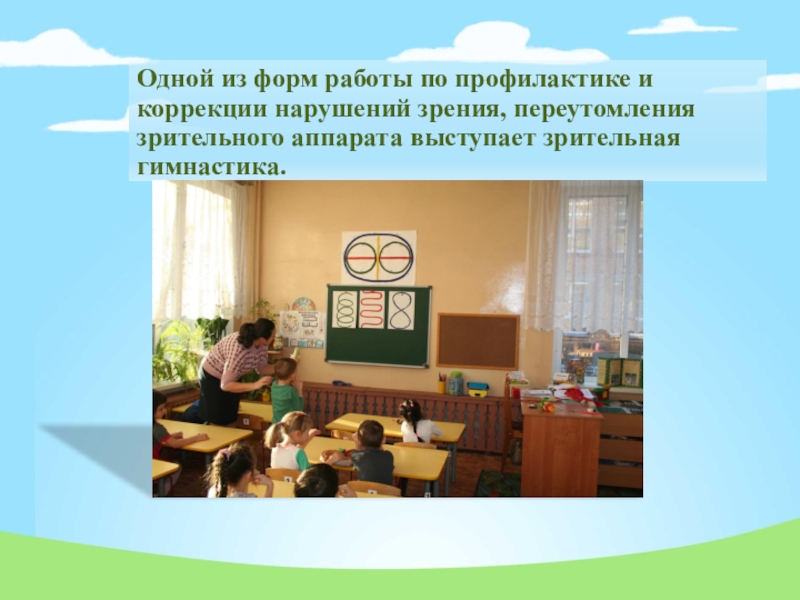Слайд 4Одной из форм работы по профилактике и коррекции нарушений зрения, переутомления