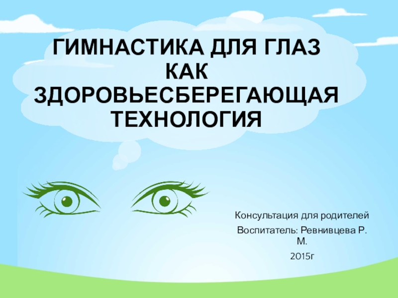 Консультация для родителейВоспитатель: Ревнивцева Р. М.2015гГИМНАСТИКА ДЛЯ ГЛАЗ КАК ЗДОРОВЬЕСБЕРЕГАЮЩАЯ ТЕХНОЛОГИЯ