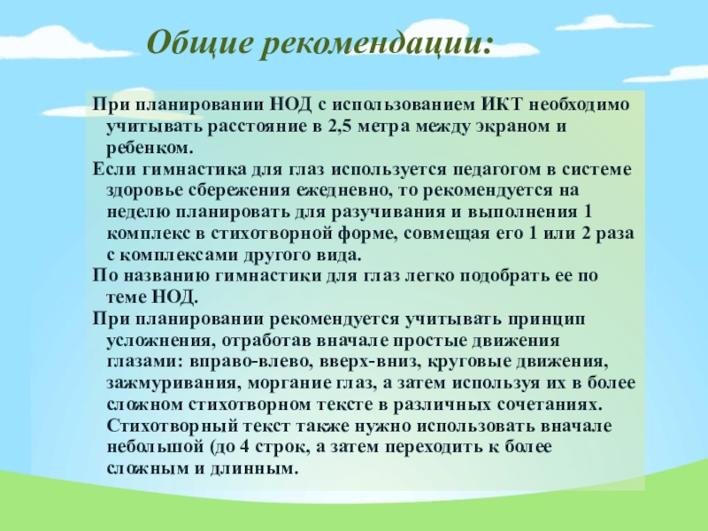 Общие рекомендации:При планировании НОД с использованием ИКТ необходимо учитывать расстояние в 2,5 метра между экраном и ребенком.