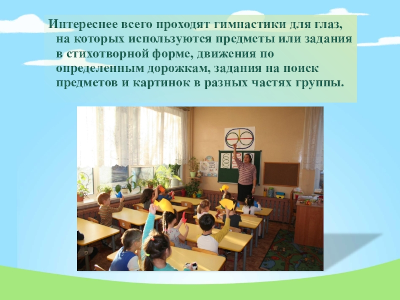 Слайд 9Интереснее всего проходят гимнастики для глаз, на которых используются предметы или