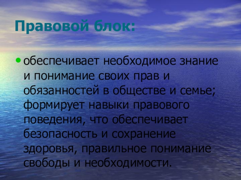 обществе и семье; формирует навыки правового поведения, что обеспечивает безопасность и сохранение здоровья, правильное понимание свободы и необходимости.