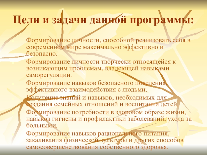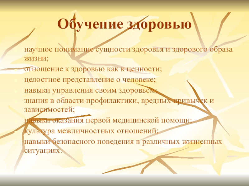 профилактики болезней. Раскрывает связь состояния психики с состоянием нашего тела. Формирует отношение к своему телу как ценности. Развивает навыки ухода за своим телом, правильного питания, режима труда и отдыха и т.д. Формируется негативное отношение к вредным привычкам, в том числе к употреблению наркотиков, алкоголя, табака, токсических веществ.