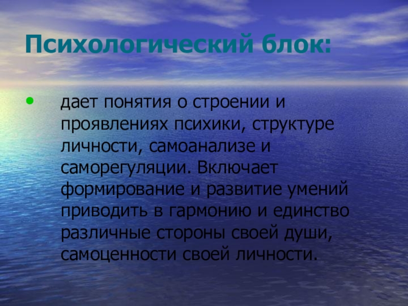 и саморегуляции. Включает формирование и развитие умений приводить в гармонию и единство различные стороны своей души, самоценности своей личности.
