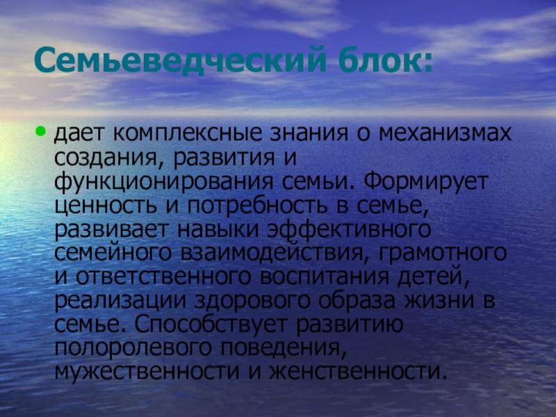 дает комплексные знания о механизмах создания, развития и функционирования семьи.