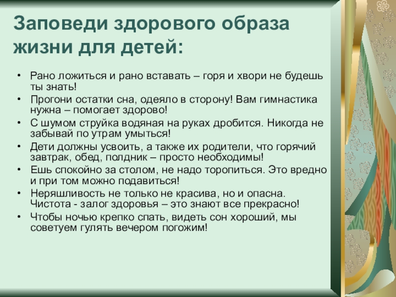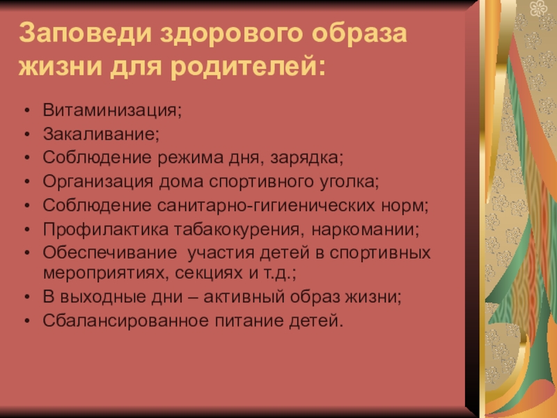 Слайд 10Заповеди здорового образа жизни для родителей: