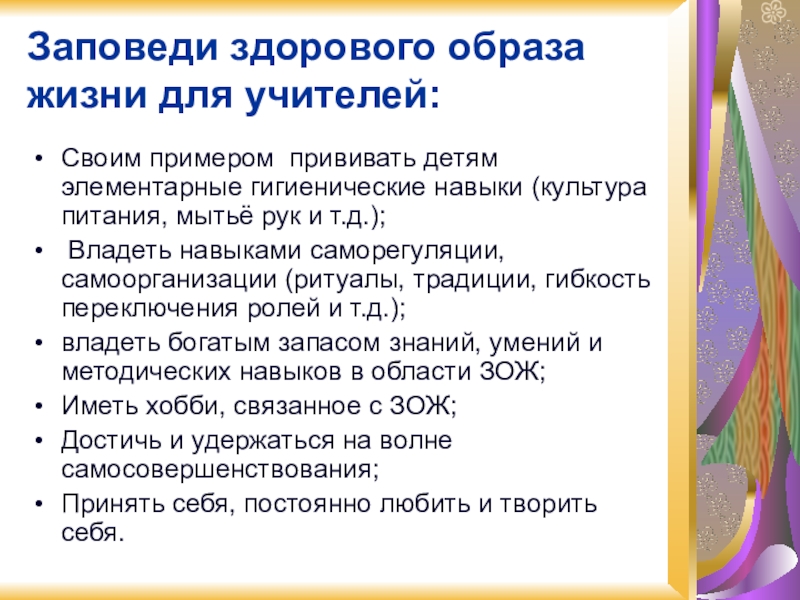 Слайд 11Заповеди здорового образа жизни для учителей: