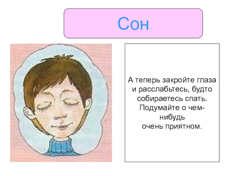 СонА теперь закройте глаза и расслабьтесь, будтособираетесь спать.Подумайте о чем-нибудьочень приятном.
